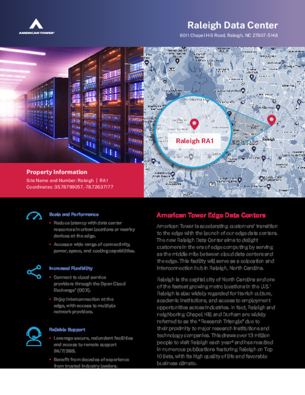 American Tower Edge Data Center, also known as RA1, is located in Raleigh, North Carolina. The facility is Approximately 5,000 square feet, with the capacity to expand up to 16,000 square feet. The site leverages direct expansion cooling and assisted hot aisle containment to offer an average of 15kW per rack.