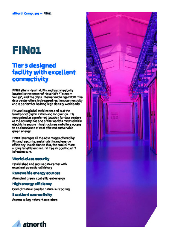 In January 2023 atNorth acquired two data centers in Helsinki from IT services firm Advania AB, the company it broke away from in 2017. FIN01 is located in the Vallila area of Helsinki, while FIN03 is in Espoo. The two facilities combined offer capacity for 500 racks. FIN01 is located in the Vallila area of Helsinki with a gross space of 1,200 sqm.