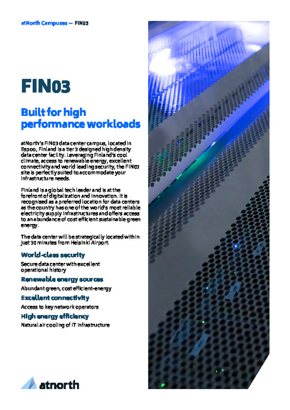 In January 2023 atNorth acquired two data centers in Helsinki from IT services firm Advania AB, the company it broke away from in 2017. FIN01 is located in the Vallila area of Helsinki, while FIN03 is in Espoo. The two facilities combined offer capacity for 500 racks. FIN03 is located in Kutojantie, Espoo with a gross space of 1,200 sqm.