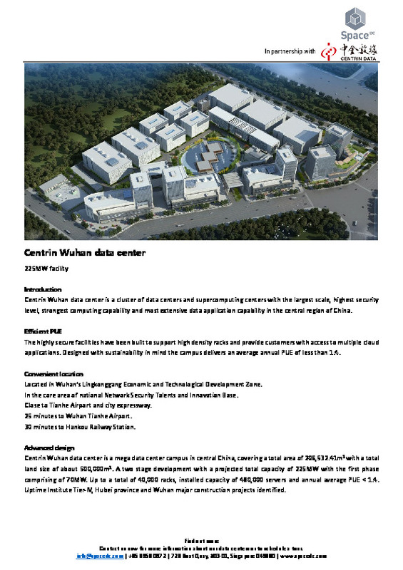The Centrin Wuhan data center campus in central China occupies a 206,532.41-square-meter site, with planned building facilities totaling 500,000 square meters. The facility is being developed in two stages. The campus will accommodate up to 40,000 racks with capacity for 480,000 servers and maintains an annual average PUE below 1.4. The project has received Uptime Institute Tier-IV certification and is recognized as a major construction project by both Hubei province and Wuhan city.