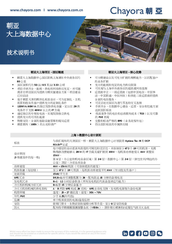 Chayora is developing a new data center campus in Shanghai, China. The project, first unveiled in November 2021, will span 8.5 acres and feature three five-story buildings. The facility is designed to accommodate 10,000 racks and aims to achieve an annual average Power Usage Effectiveness (PUE) of 1.25.