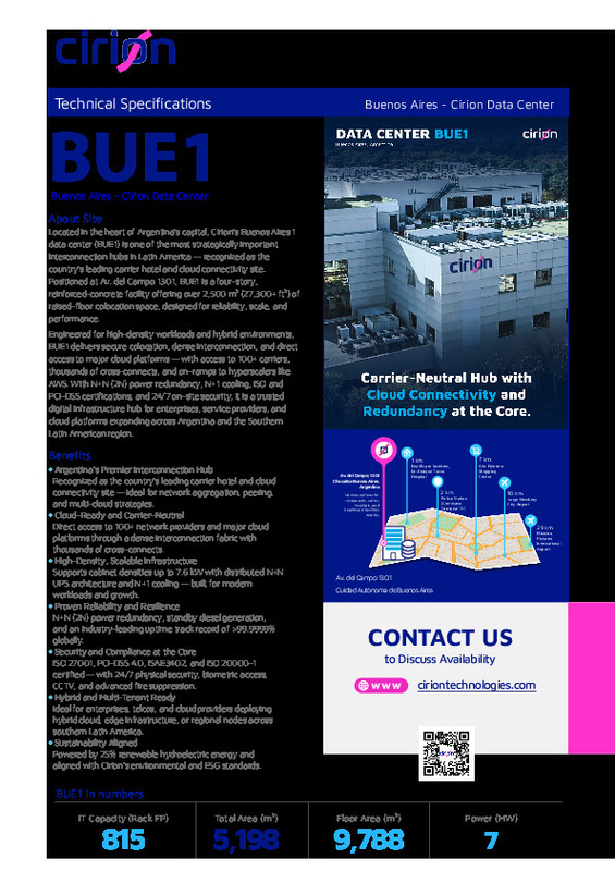 This facility, formerly known as a Level3 site, was rebranded to Cirion. In 2025, Cirion Technologies announced the expansion of its BUE1 data center in Buenos Aires, Argentina. The expansion will add approximately 160 new racks, which will support intensive workloads, including those for artificial intelligence (AI).