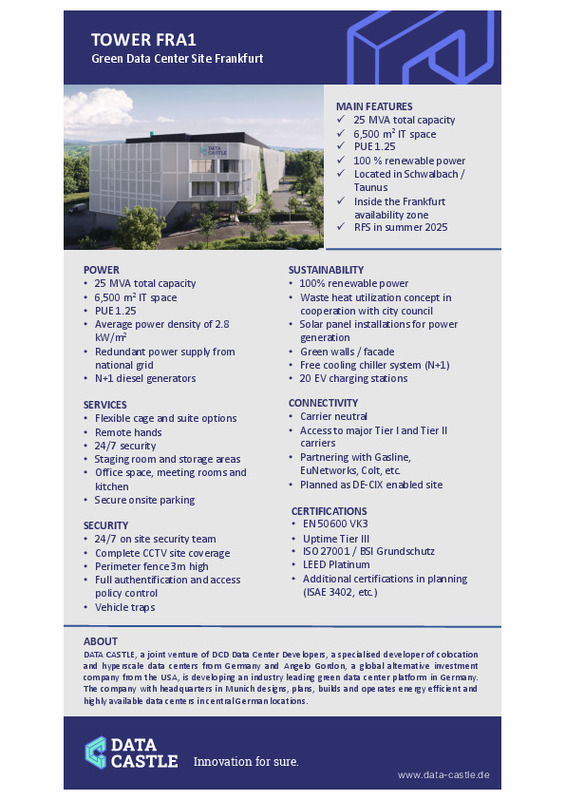 DATA CASTLE is a joint-venture between DCD Data Center Developers, a specialist developer for colocation and hyperscale datacenters from Germany, and Angelo Gordon (TPG), a global investment company from the US.