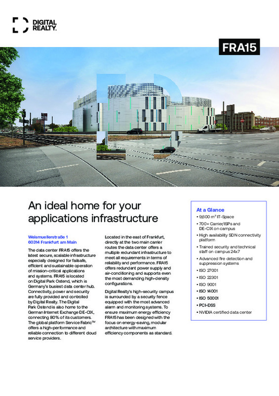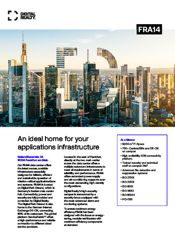 Digital Realty, formerly known as Interxion, has a significant presence in Frankfurt with a campus that has the densest concentration of networks in the city. The campus consists of 16 buildings, all located within a few city blocks of each other.