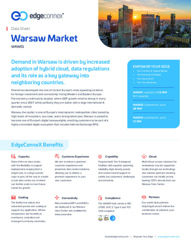 The EdgeConneX WAW02 facility, a hyperscale, carrier-neutral, Tier-3 designed data center offering N+1 configuration, launched in Warsaw, Poland, in 2022.