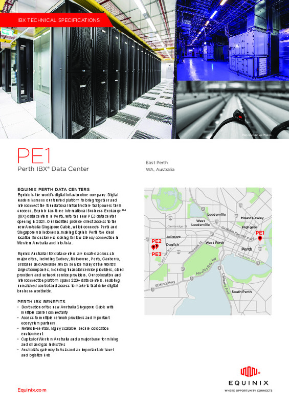 Equinix PE1 Perth Data Center is situated at 3 Tully Road, Perth WA 6004, Australia. PE1 is one of two Perth-based data centres that Equinix inherited from the Metronode acquisition. The facility spans 7,113 sq ft, with 4,811 sq ft of raised floor space available for colocation.