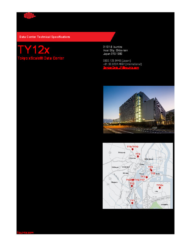 Equinix opened a new hyperscale data center, TY13x, in Tokyo, Japan in 2023. The facility is located in the Inzai region, adjacent to the existing TY12x data center.