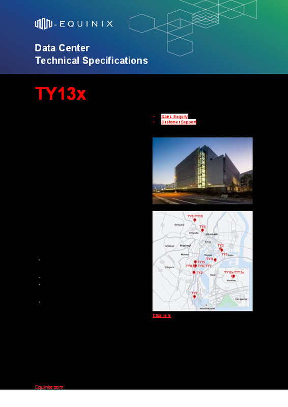 Equinix opened a new hyperscale data center, TY13x, in Tokyo, Japan in 2023. The facility is located in the Inzai region, adjacent to the existing TY12x data center.