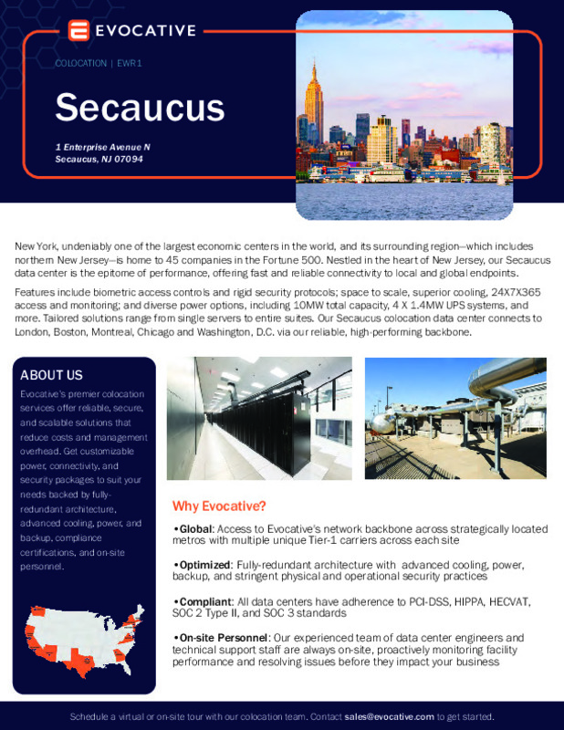 Centersquare's Secaucus data center is located just the other side of the Lincoln Tunnel and 14 miles from Newark Airport.