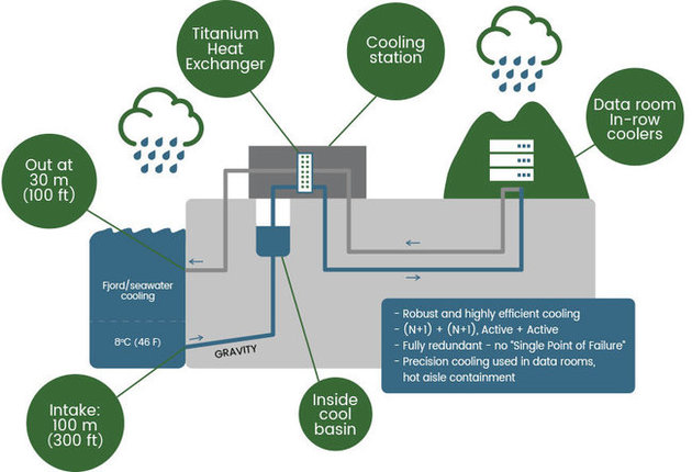 DC1-Stavanger has a cooling source available from an adjacent deep water fjord. At levels below 75 m depth the water temperature is stable at 8 oC (46F) all year round. Our cooling system uses gravity effect to bring the cold water from a depth of 100 m to the data centres cooling station without using any energy.