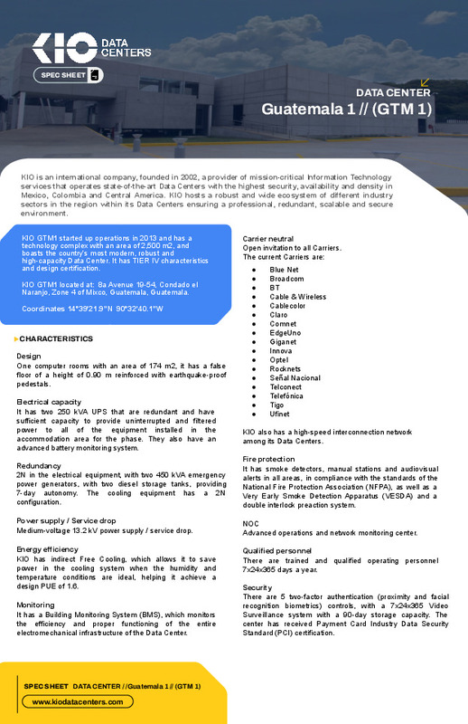 KIO GTM1 started up operations in 2013 and has a technology complex with an area of 2,500 m2. It has TIER IV characteristics and design certification.