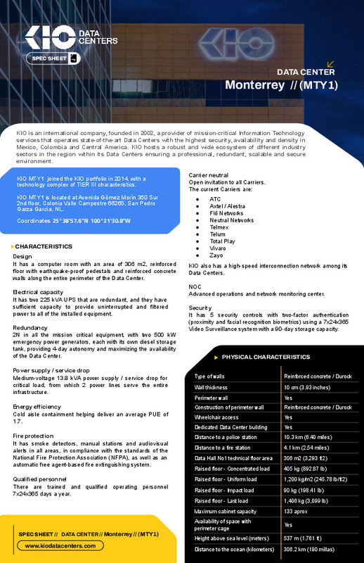 KIO MTY1 joined the KIO portfolio in 2014, with a technology complex of TIER III characteristics. It has a computer room with an area of 306 m2, reinforced floor with earthquake-proof pedestals and reinforced concrete walls along the entire perimeter of the Data Center.