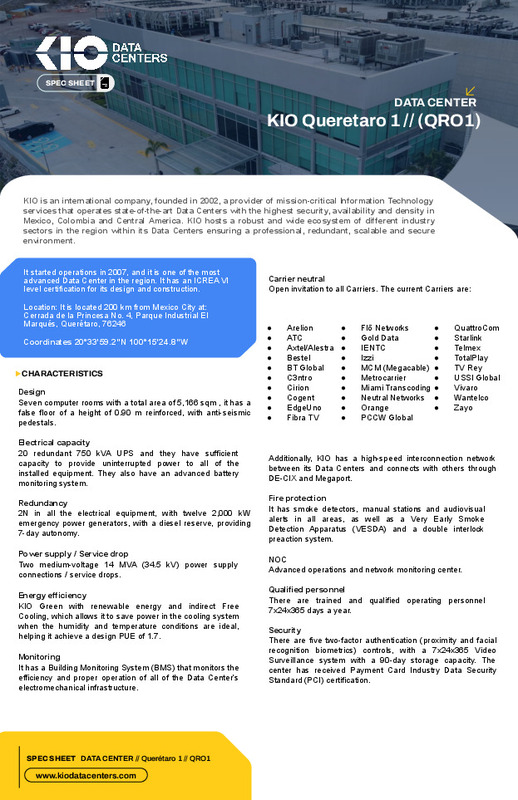 Founded in 2002, KIO Networks Group is an international provider of mission critical and outsourced Information Technology services. The firm operates its latest generation Data Centers offering the highest security, availability and density in Mexico, Latin America, Caribbean and Europe.