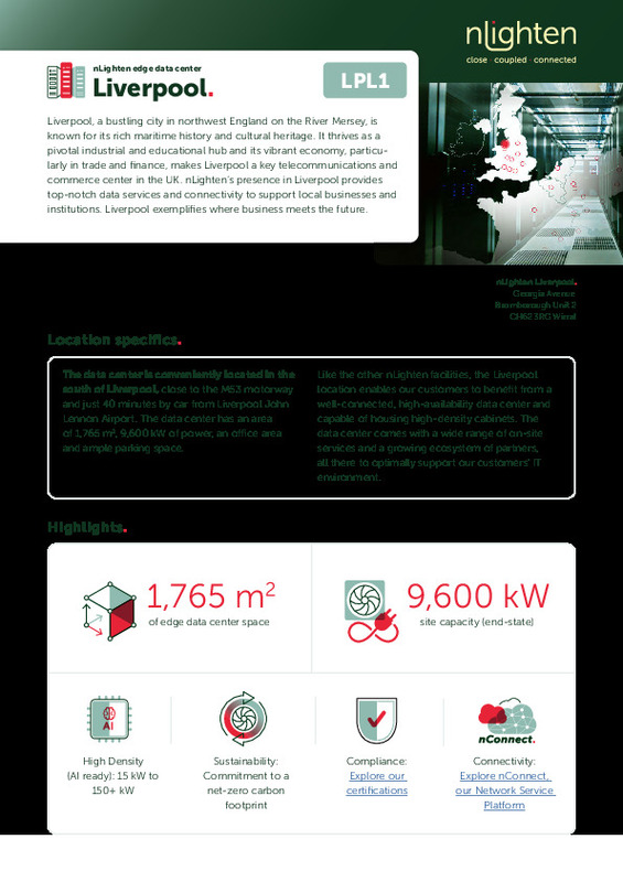 This facility was formerly operated by Proximity Data Centres before being acquired and rebranded by nLighten in late 2023. It serves as a primary edge hub for the Liverpool and North Wales region, targeting Tier III design standards.