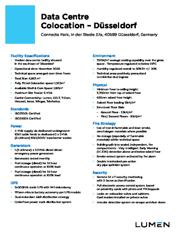 • Carrier Connectivity: Lumen, COLT, T-Com, Versatel, Arcor, Wingas, Telefonica.