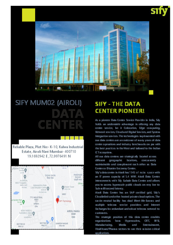 Sify's data center in Airoli has space for 1,345 racks. The Airoli Data Center interconnects with Sify's Rabale Data Center and provides access to hyperscale public clouds with very low to sub-millisecond latency.