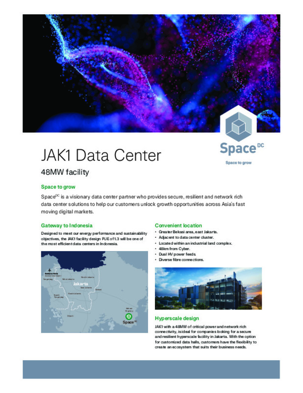 JAK1 with a 48MW of critical power and network rich connectivity, is ideal for companies looking for a secure and resilient hyperscale facility in Jakarta. With the option for customized data halls, customers have the flexibility to create an ecosystem that suits their business needs.
