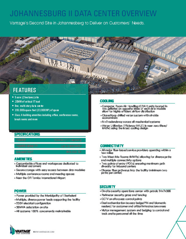 The first building of the JNB2 Islando campus consists of a 355,000 square foot (33,000 square meters) two-story data center. This is Vantage Data Centers' second campus in Johannesburg, South Africa.