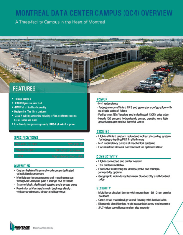 QC4C data center building is the third facility of Vantage's Montreal II campus. The building spans 94,000 gross square feet of space and came online in 2022.